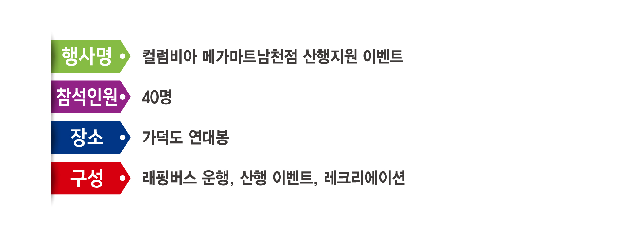 | 제목 | 컬럼비아 메가마트남천점 산행지원 이벤트 |